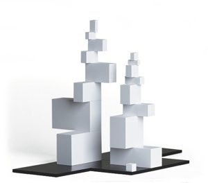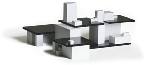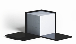 This cube is divided several times in adherence to the golden ratio and surrounded by black shapes. During play, these become foundations, walls or roofs and a player the architect. Everything fits into each other harmoniously.